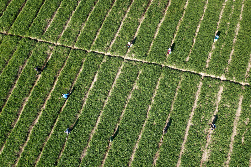 2023年1月31日,村民在浙江省诸暨市同山镇绿剑村的田间护理小麦(无人机照片)。新华社发(郭斌 摄)