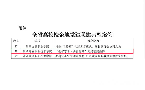 近日,省委教育工委公布了全省高校校企地党建联建典型案例,我校工商管理学院党总支“数智零售·共富先锋”党建联建矩阵案例成功入选。
