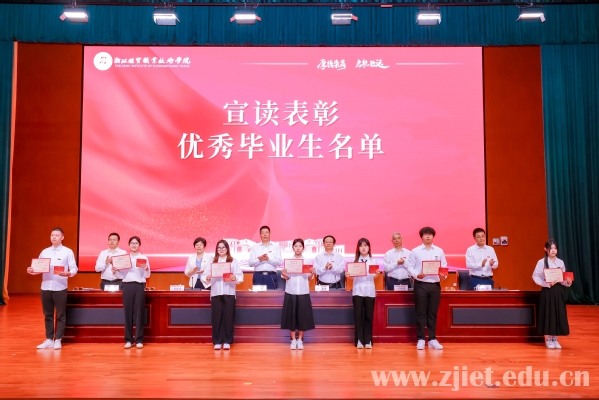 副校长林锋宣读《关于表彰2024届优秀毕业生的决定》。115人荣获“2024届浙江省普通高等学校优秀毕业生”称号,388人荣获“2024届校级优秀毕业生”称号。学校领导为浙江省优秀毕业生代表、学校优秀毕业生代表颁发荣誉证书,并为毕业生代表颁发毕业证书、赠送纪念徽章和《毕业生廉洁从业教育手册》等毕业专属纪念品,勉励全体毕业生坚定自信,一路清风,追光前行。